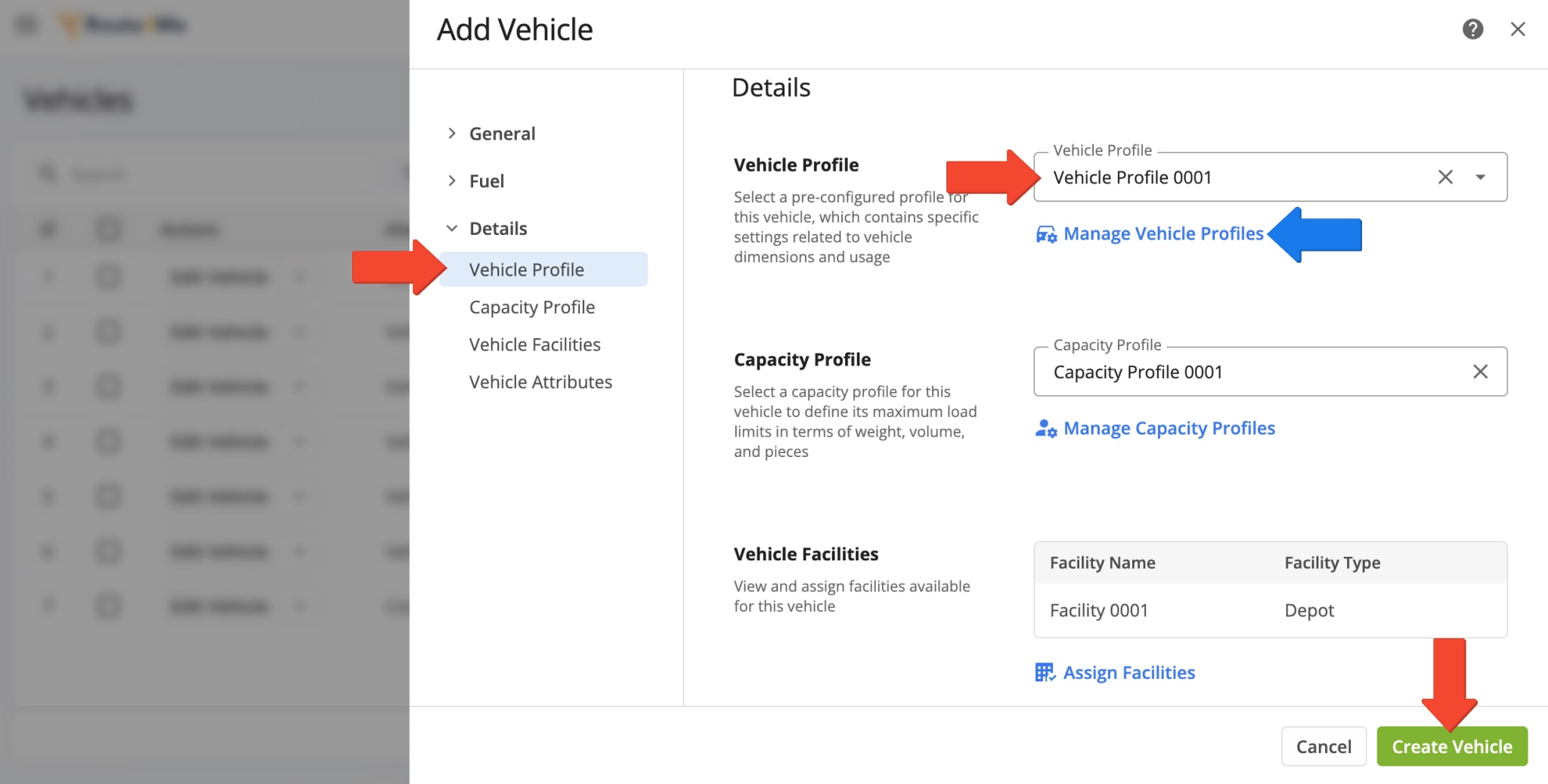 To create a new Commercial Vehicle, you need to select or create a Vehicle Profile with commercial vehicle details such as height, weight, axle count, etc. Scroll down to “Vehicle Profile“, located in the “Details” section, select a profile, and click “Create Vehicle” when done.
