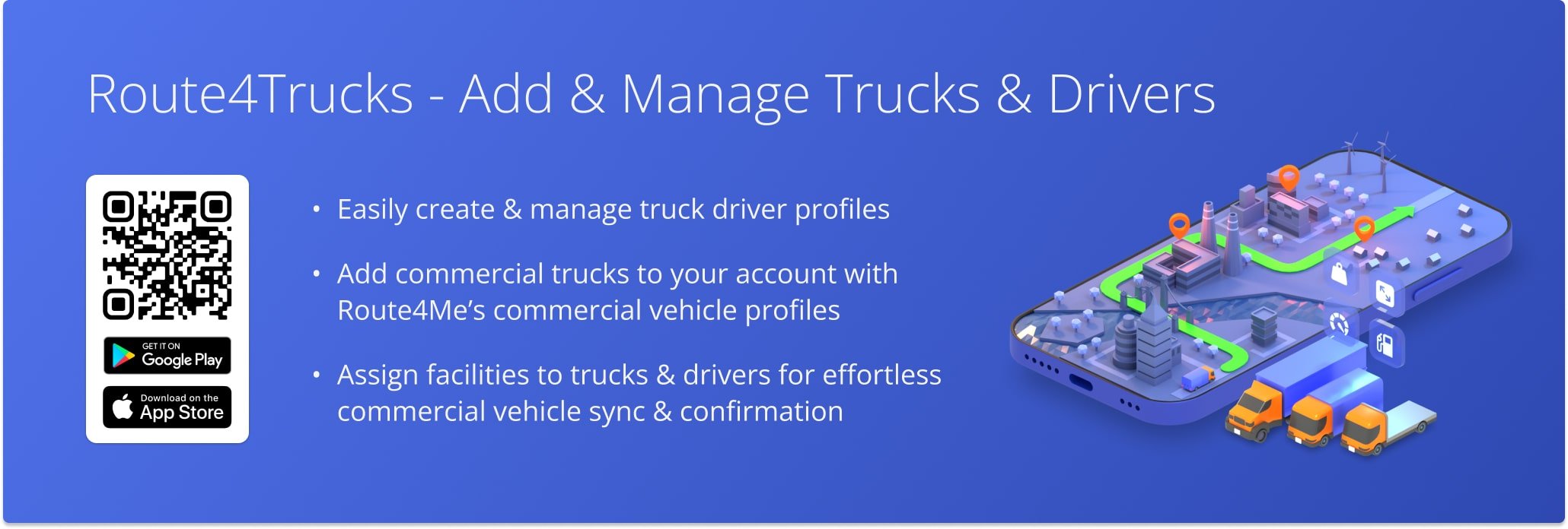 NOTE: Commercial driver and vehicle management are enterprise features of the Route4Trucks app. To enable this integration of Route4Trucks with your Route4Me team and fleet management functionality, contact Route4Me support.