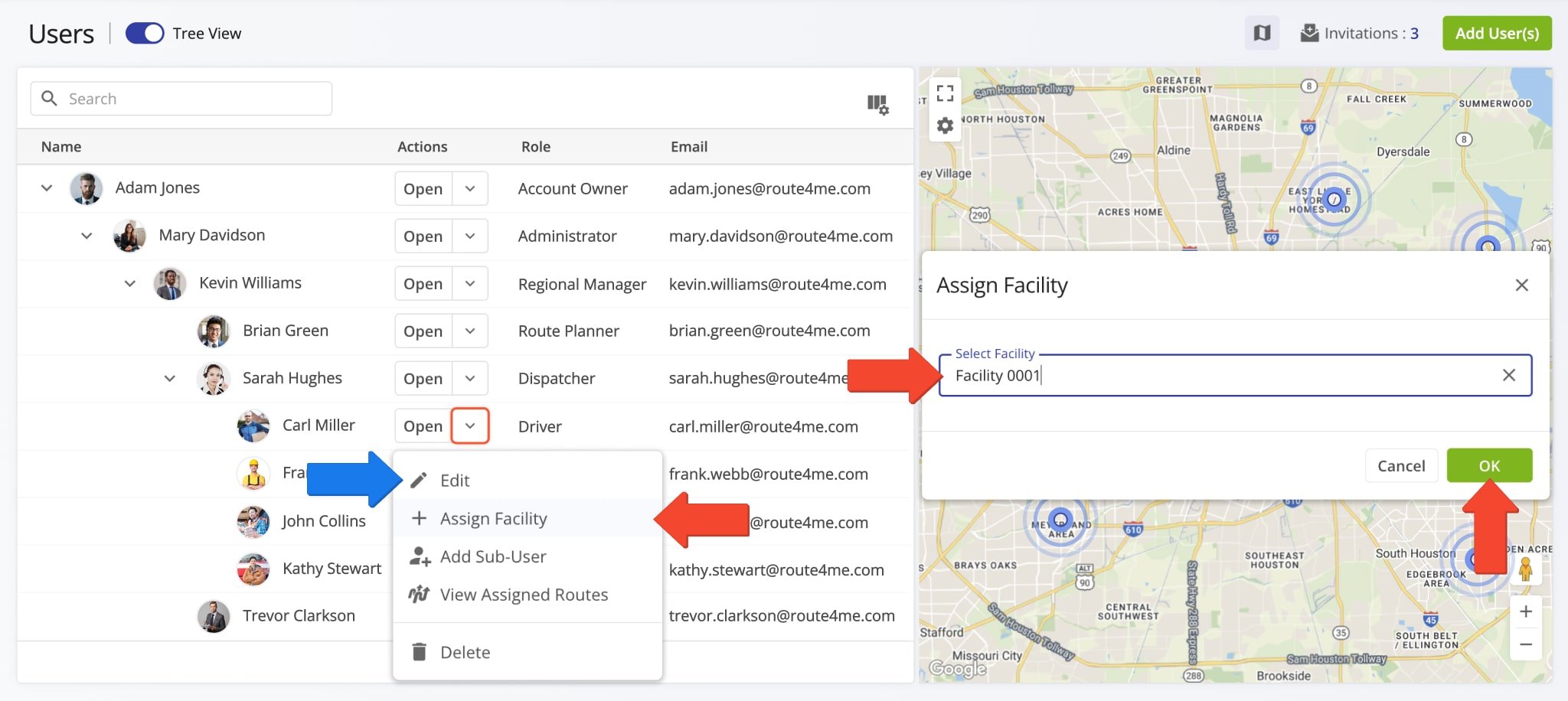 | Assign Facility | Associate a User with a Facility on your Route4Me account. For Route4Trucks Users, assigning a Facility enables selecting and confirming Vehicles with the same assigned Facility. |