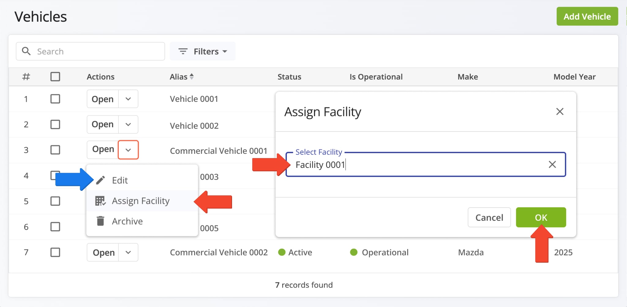 You can also select “Edit” from the Vehicle Management actions menu and assign a Facility. Learn more about editing Vehicles.