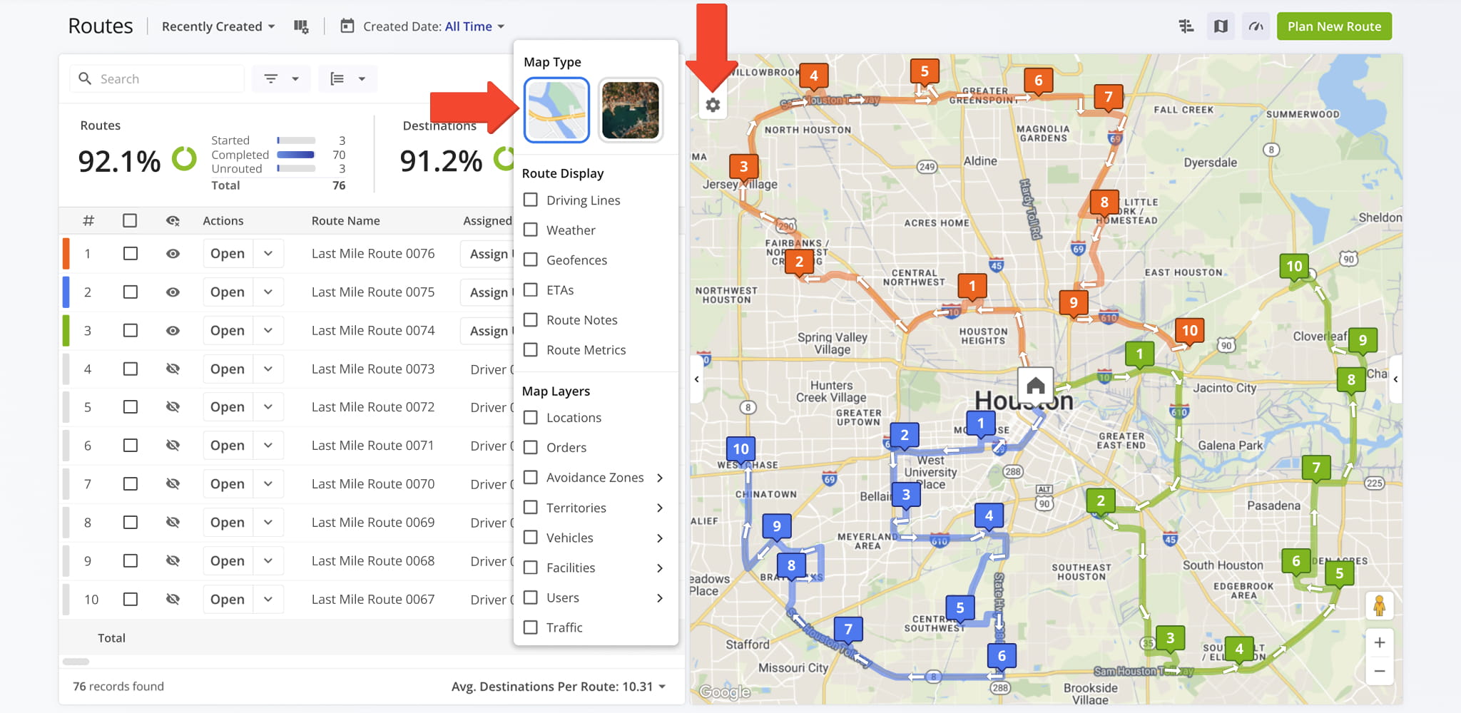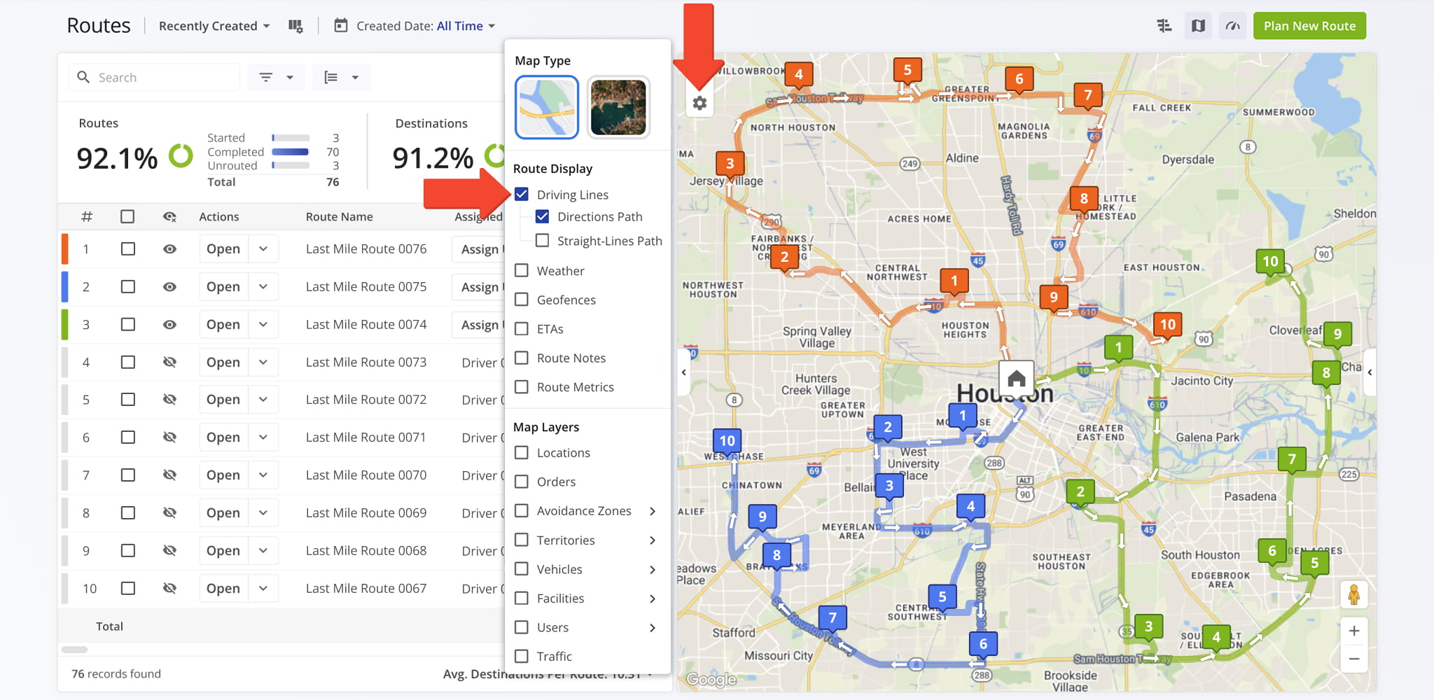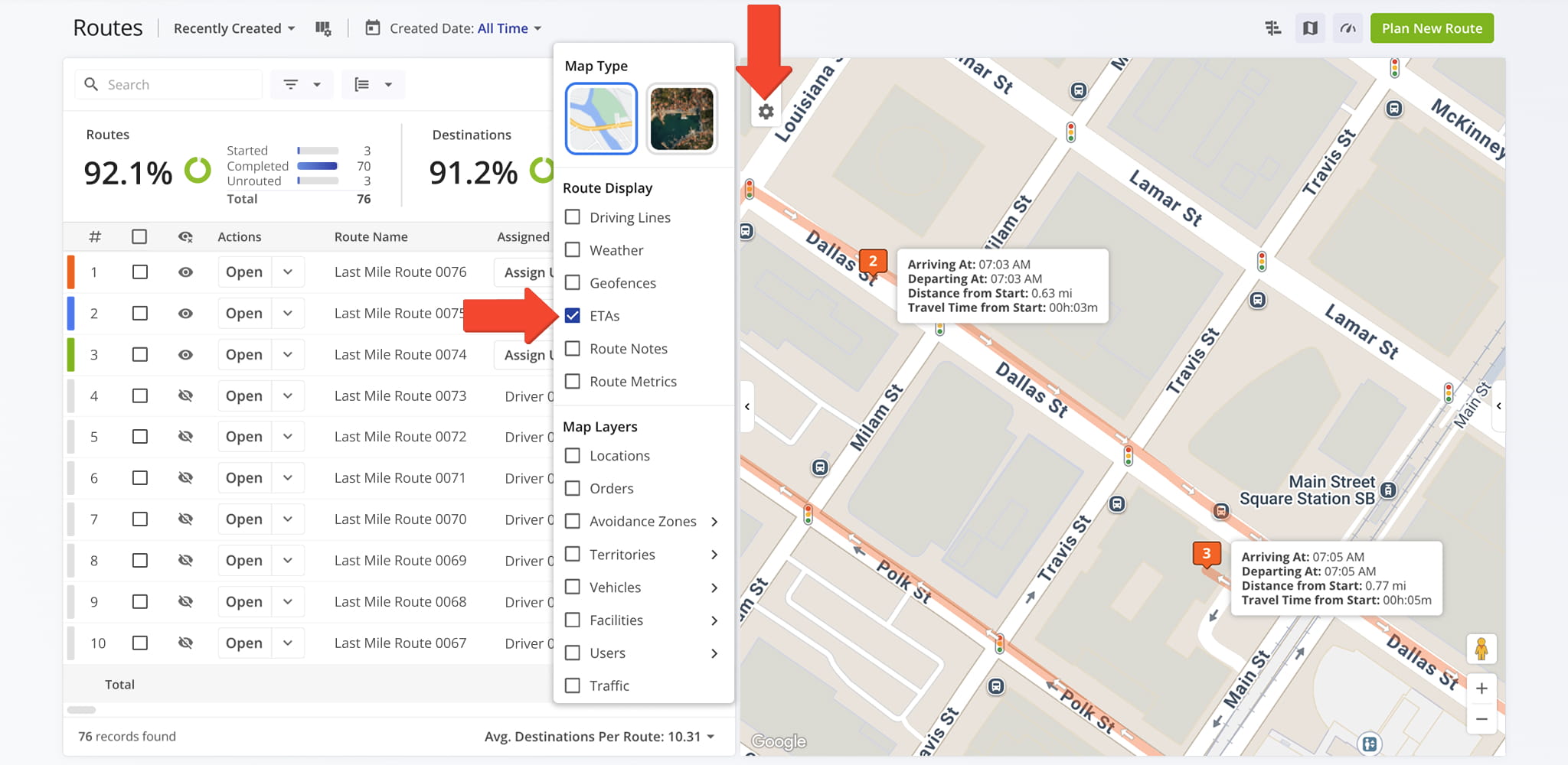 Use Route Display settings, accessed via the Gear Icon in the upper-left corner, to customize how routes and destinations appear on the map. Display settings can be combined or used individually to suit your workflow and make route review more efficient.