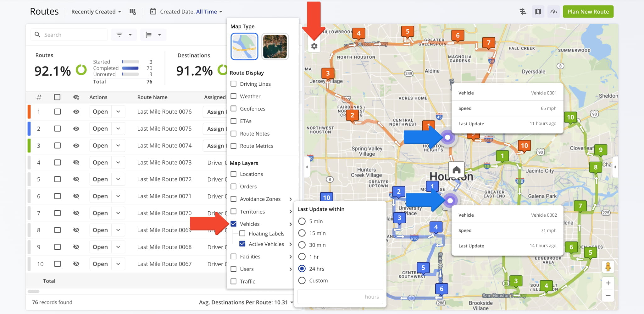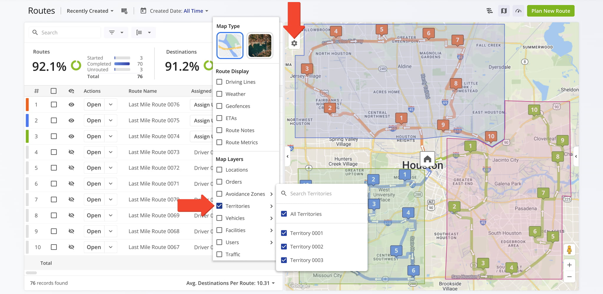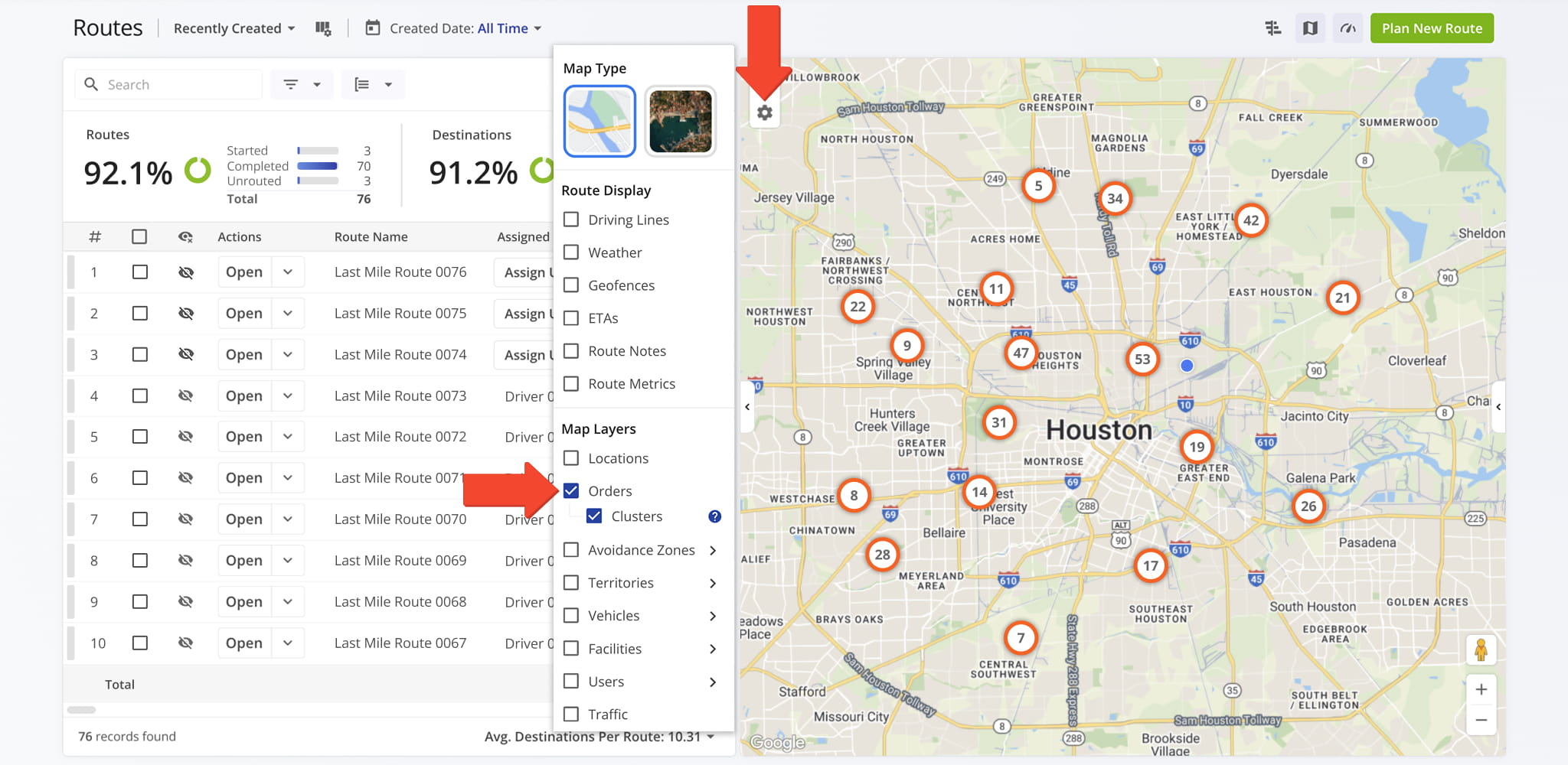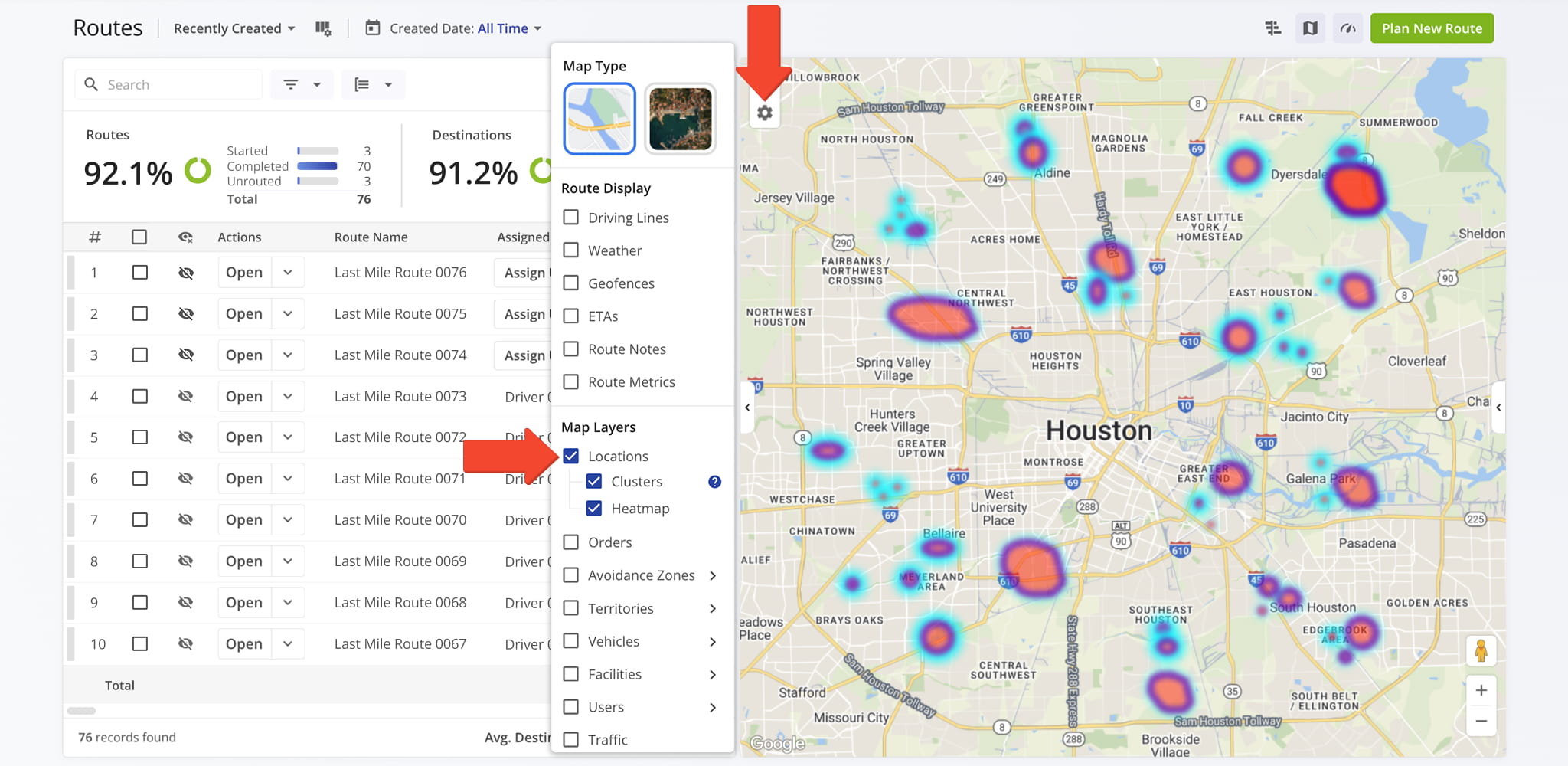 Use Route Display settings, accessed via the Gear Icon in the upper-left corner, to customize how routes and destinations appear on the map. Display settings can be combined or used individually to suit your workflow and make route review more efficient.