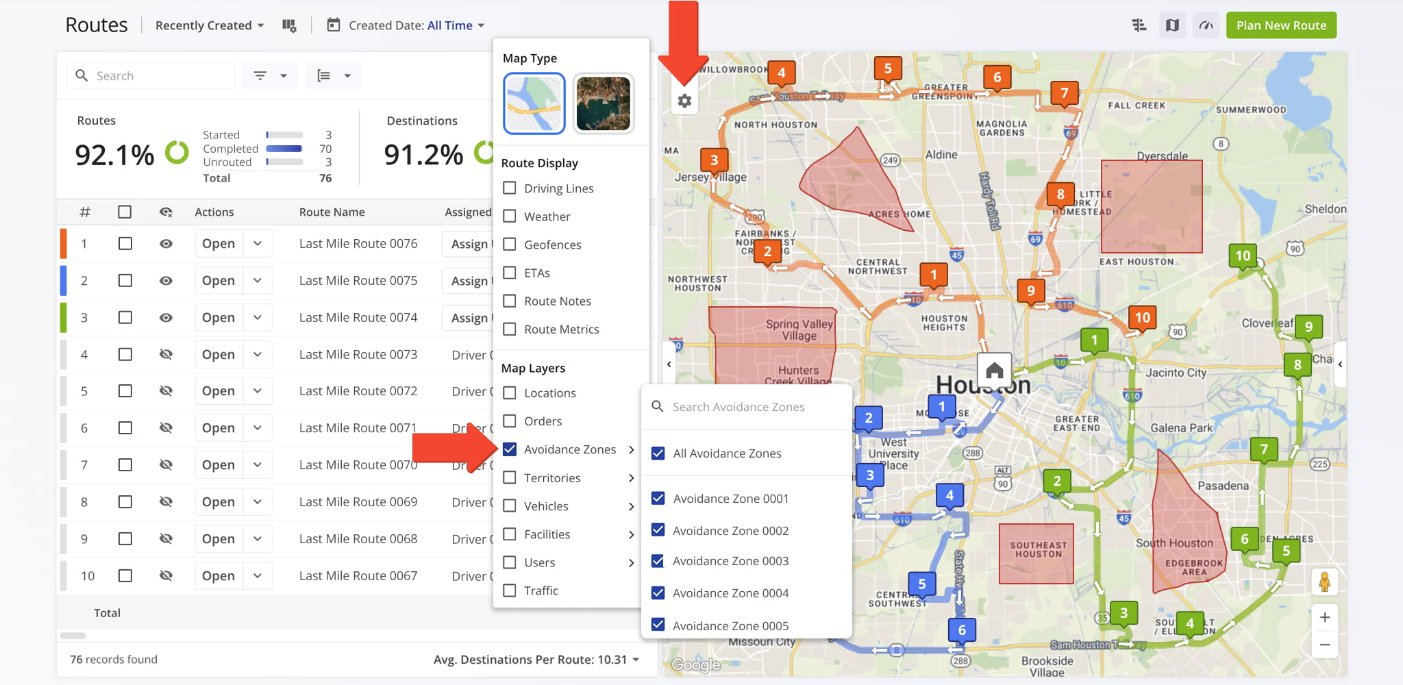 The Avoidance Zones layer shows all restricted areas on your routes map.