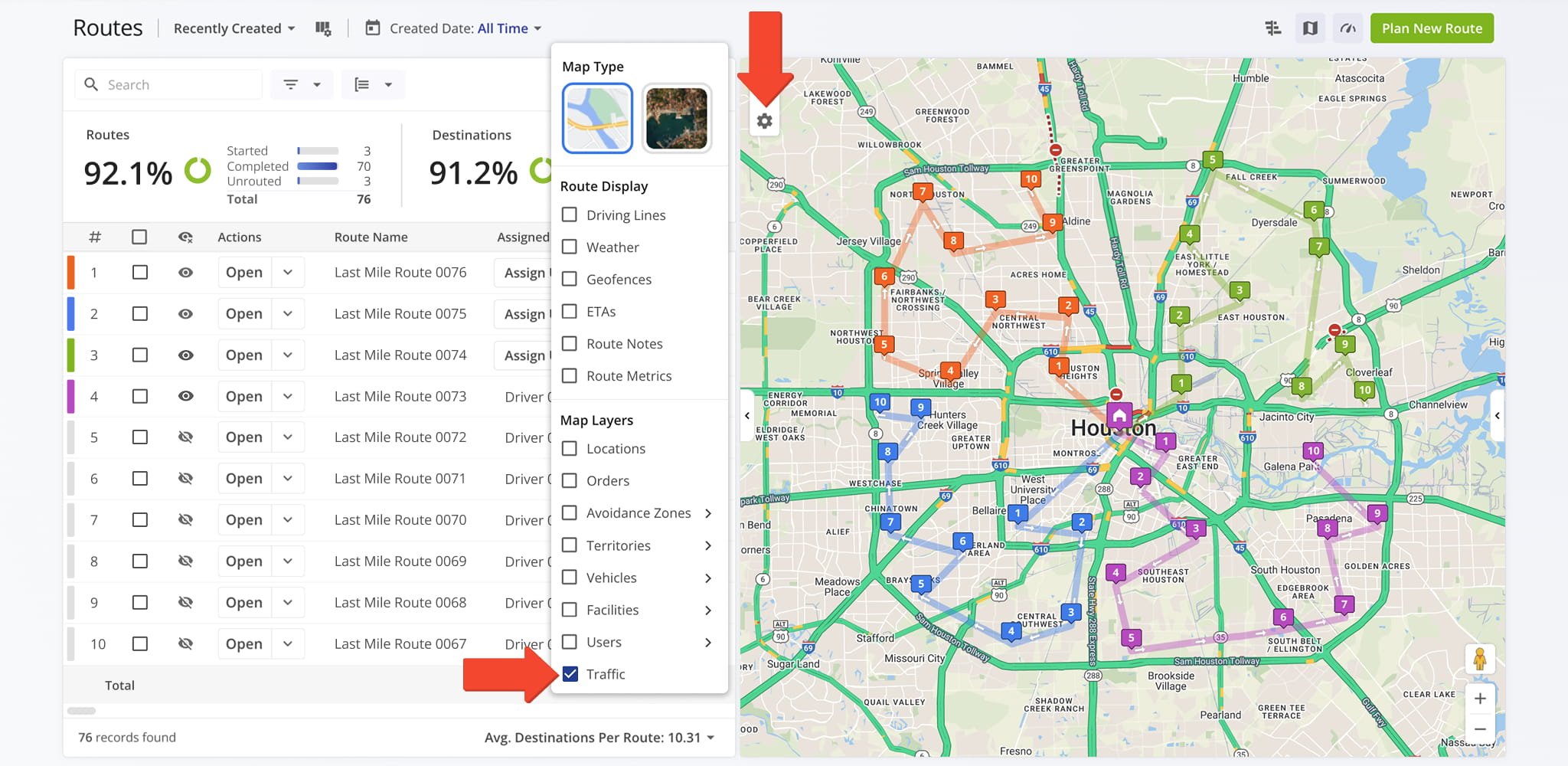 The Traffic layer overlays current traffic conditions on the map. This helps you identify congestion and adjust route planning to minimize delays and improve on-time performance.