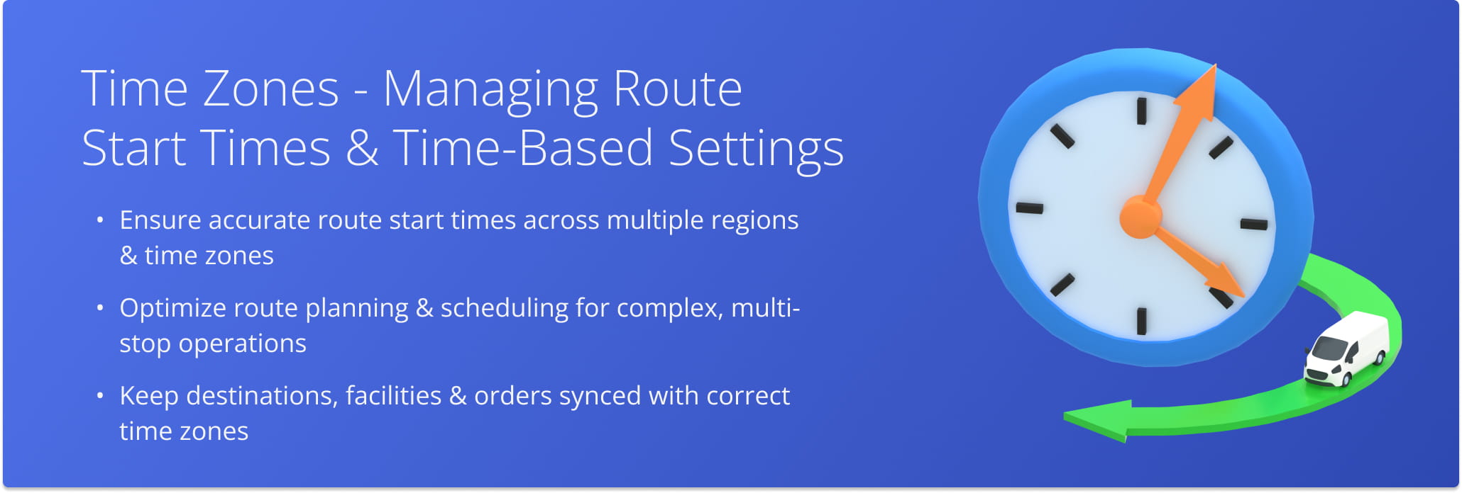 Route start times, scheduling, and time-based calculations typically follow your browser’s detected time zone. However, if the browser time zone cannot be determined, the account time zone will be used instead.