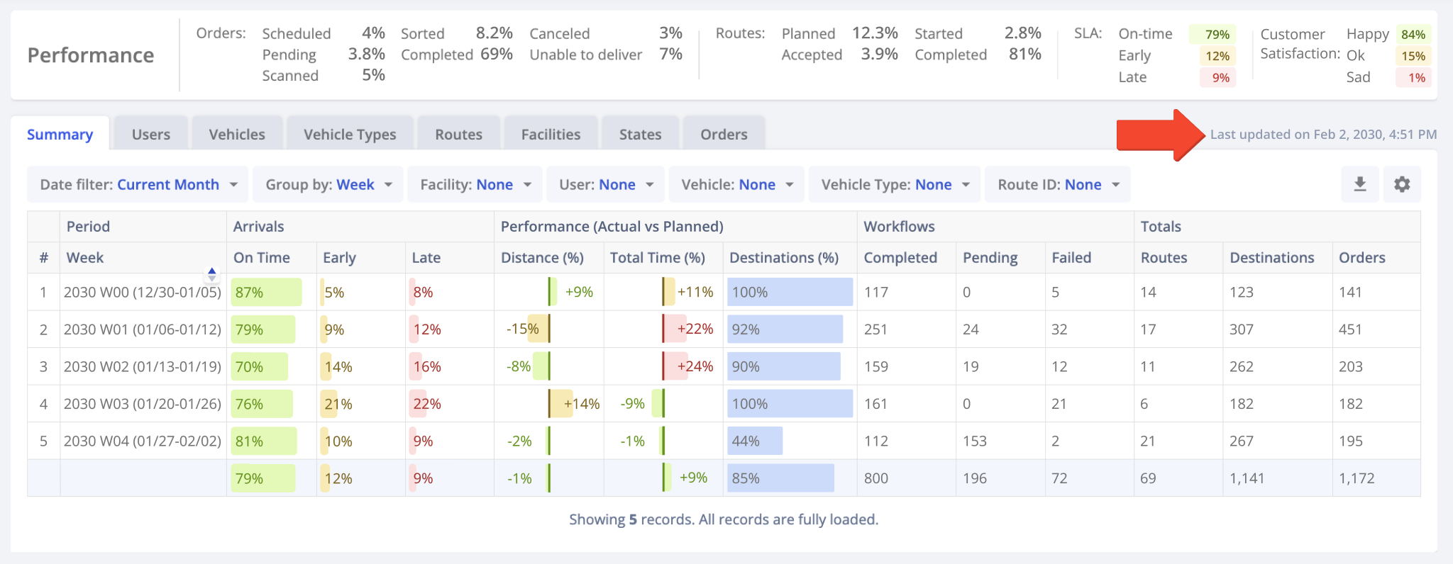 If drivers completed routes in other time zones, the reported times will match your browser’s time zone, not the local time at the stops. To access Business Insights, go to “Business Operations” > “Business Insights” from the Navigation Menu.