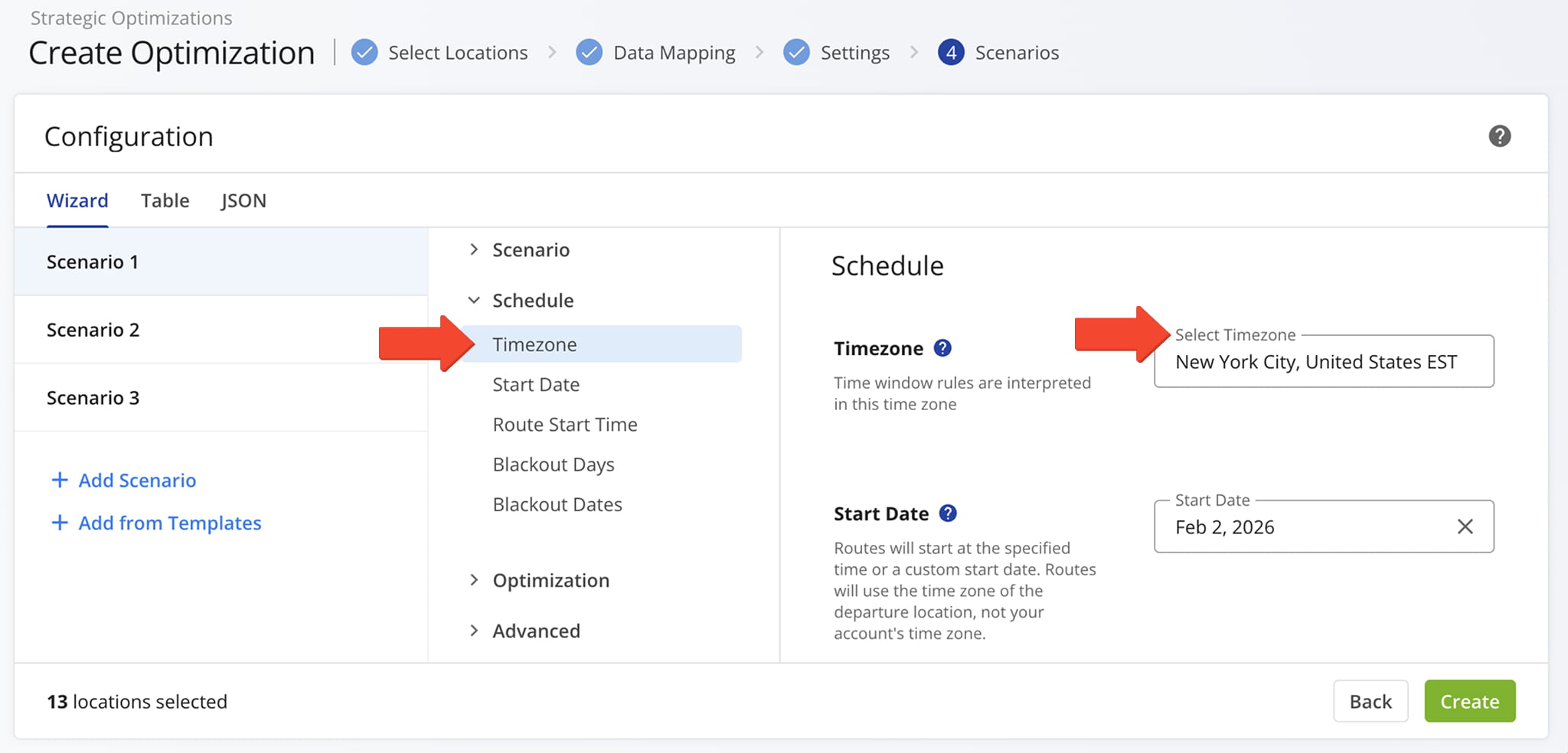 To set the time zone for an Optimization Scenario, go to “Strategic Routing” > “Scenarios“, click the “Create Optimization” button (or open an existing Scenario), and define the time zone in the Configuration settings.