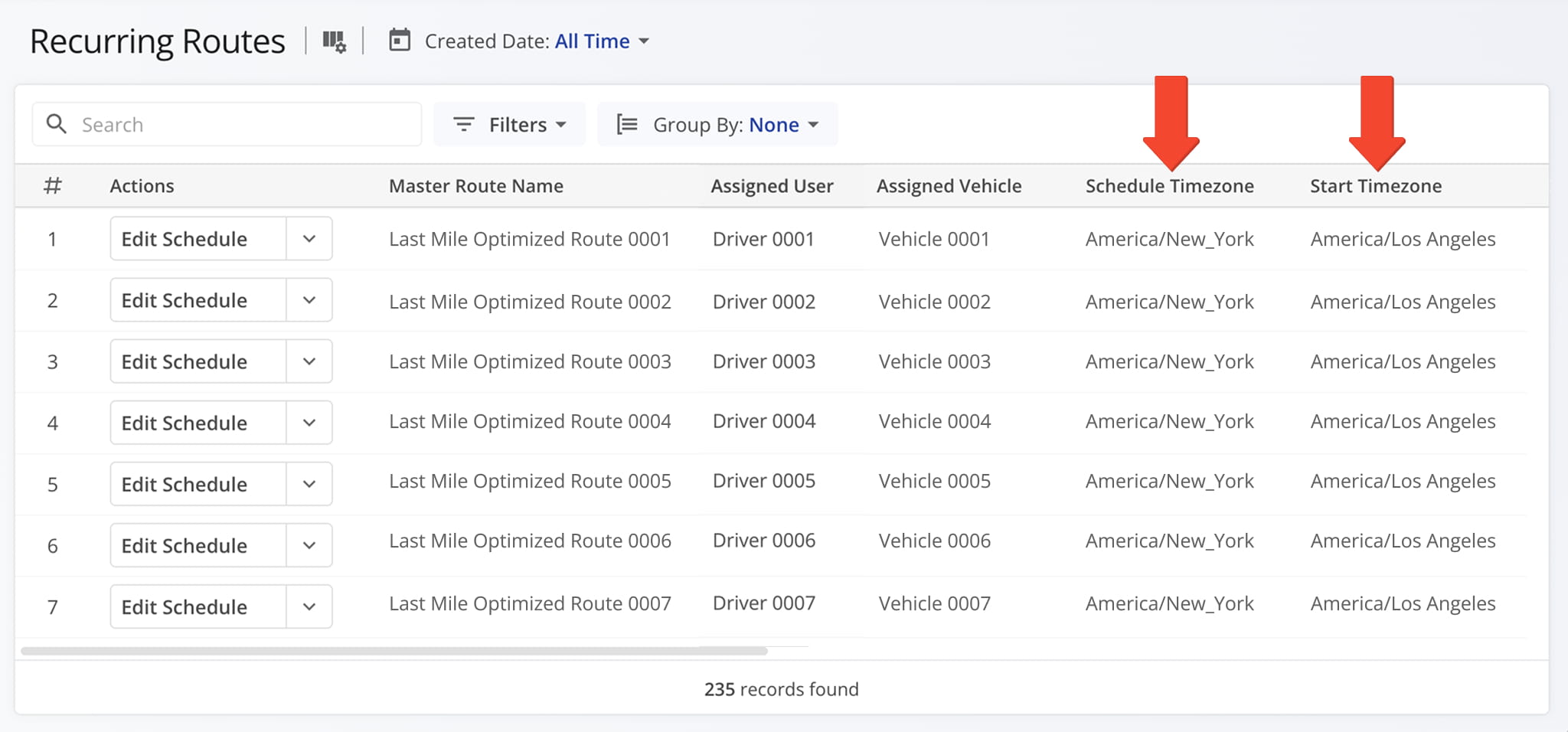 To view Master Routes time zone details, go to “Strategic Routing” > “Recurring Routes” from the Navigation Menu. Then search for the “Scheduled Time Zone” and “Start Time Zone” data columns.