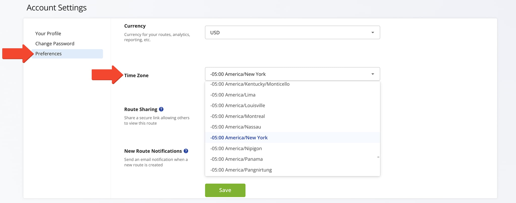 You can select a time zone in your account settings, but this setting is for reference only. It does not affect route start times, scheduling, or time-based calculations, which follow default browser-based time zone logic.