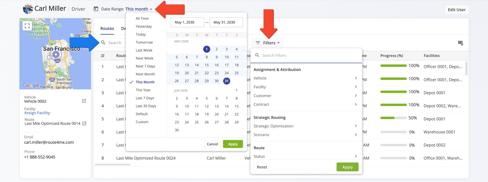 You can also use the “Date Range” field to narrow the displayed routes, destinations, or orders to a specific timeframe.