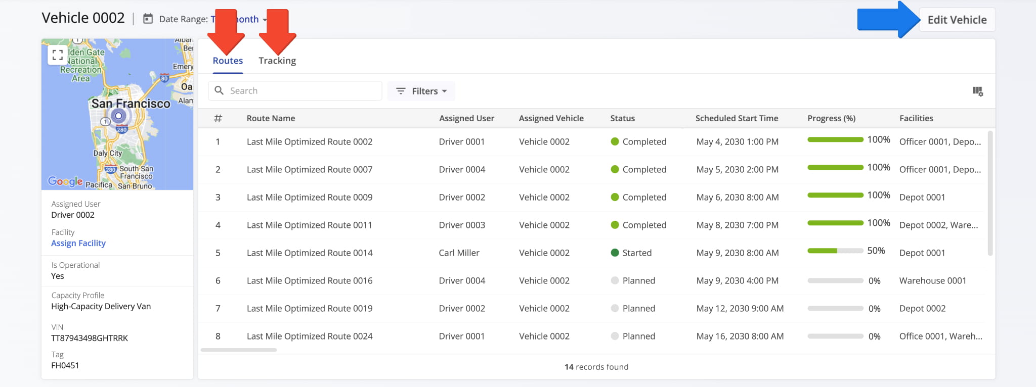 By default, the “Routes” tab opens to show a detailed, customizable table of all routes assigned to the vehicle. From the “Tracking” tab, you can view the vehicle’s real-time GPS location, along with its current status, movement, and operational data.