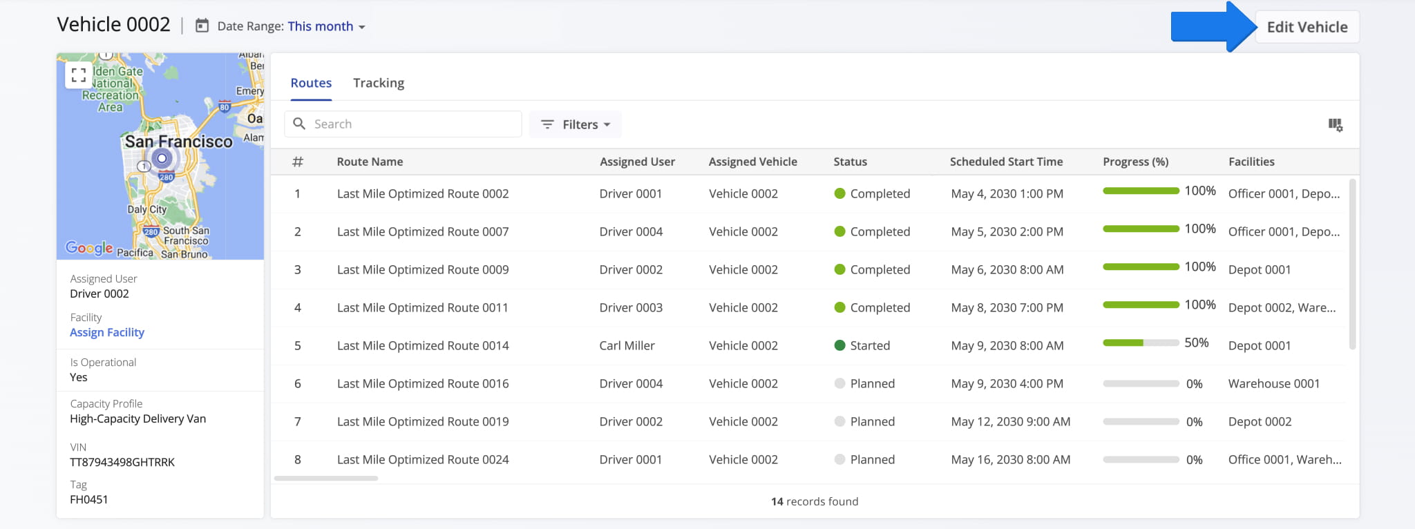 From here, you can also access the Vehicles Page where you can make changes to a Vehicle’s details, vehicle capacity profiles, commercial truck parameters, and more. To do so, simply click the “Edit Vehicle” button.