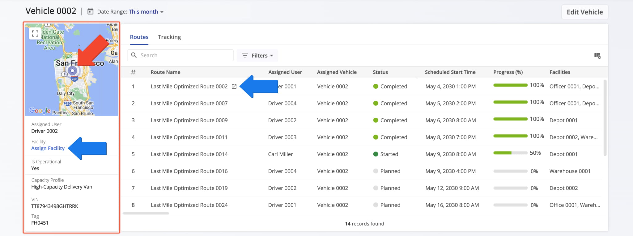 Additionally, you can click “Assign Facility” to associate one of your Facilities with the Vehicle or click the Go-to Icon next to a route to open it in the Route Editor.
