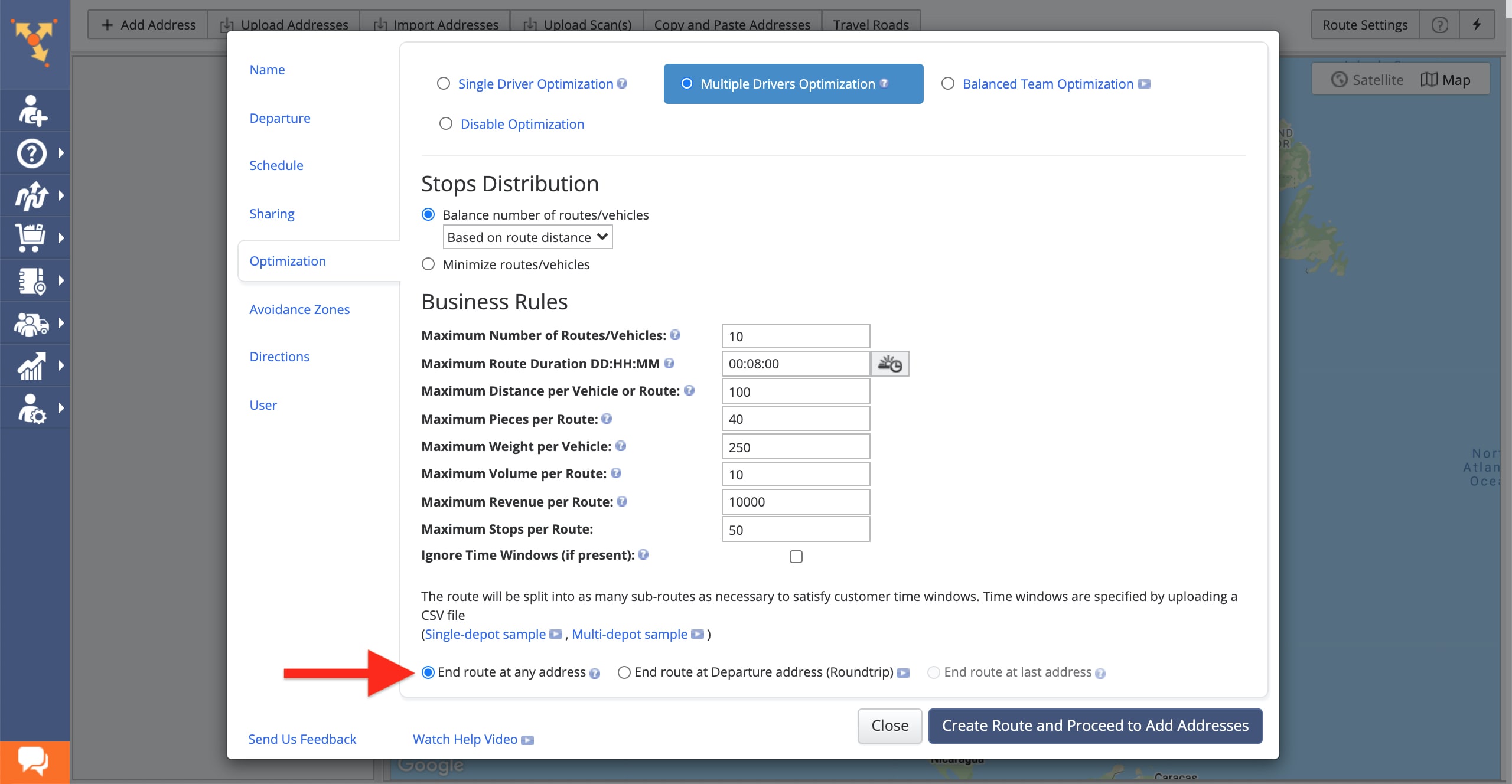 Với tùy chọn kết thúc tuyến đường xe tải tại địa chỉ bất kỳ, phần mềm định tuyến xe tải Route4Me sẽ tự động tính toán điểm dừng tối ưu nhất để kết thúc tuyến đường.