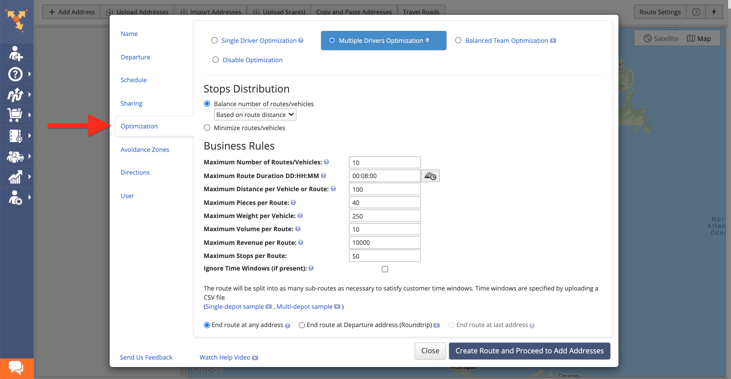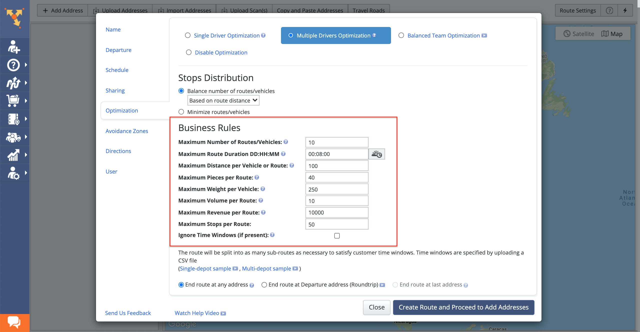 Bước cuối cùng trước khi tối ưu hóa tuyến đường xe tải là thêm các điều kiện tối ưu hóa và quy định kinh doanh. Khi đó, bạn sẽ điều chỉnh kết quả định tuyến xe tải sao cho phù hợp với nhu cầu khách hàng và yêu cầu kinh doanh của bạn.
