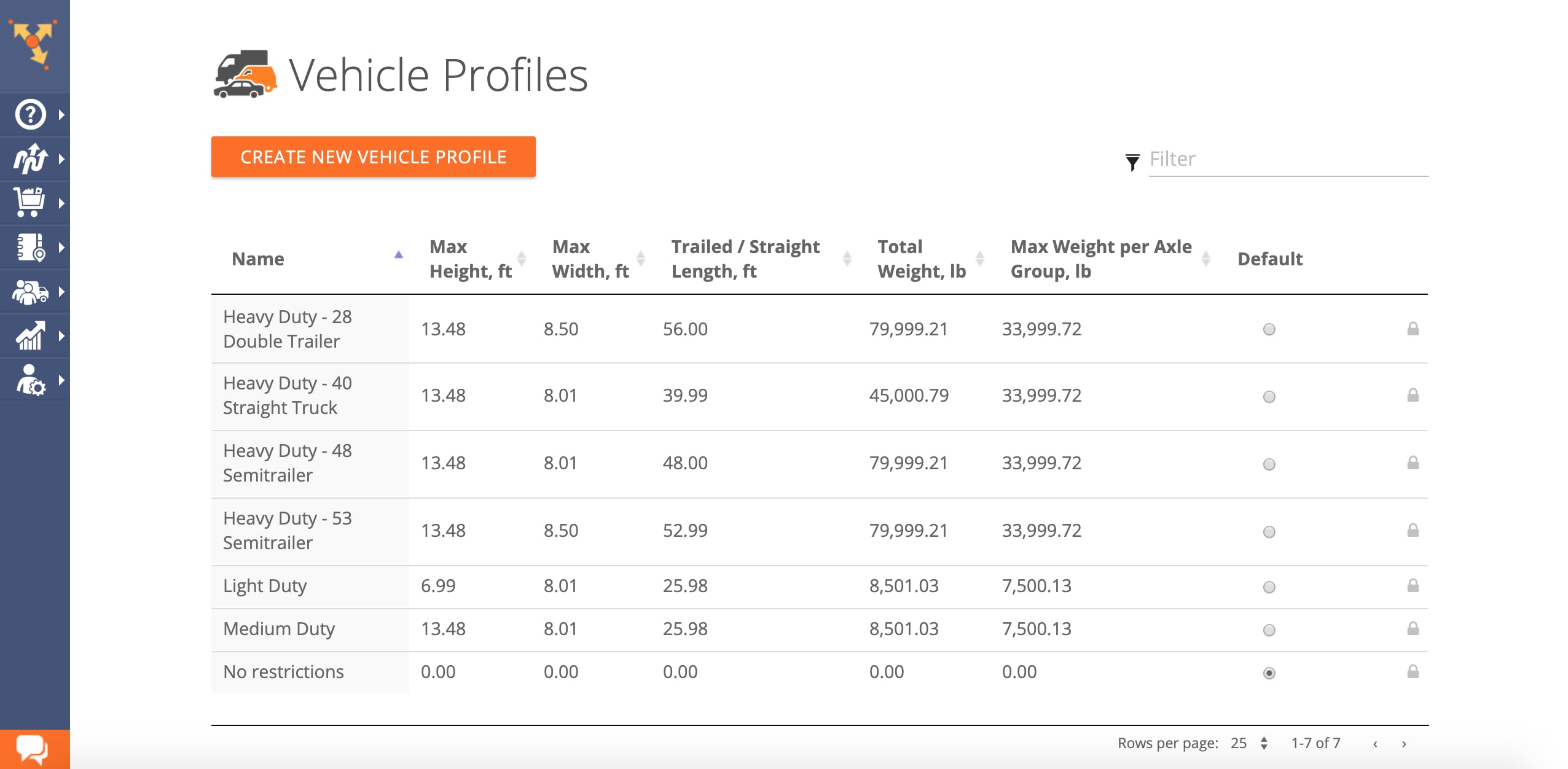 Phần mềm lập kế hoạch tuyến đường xe tải của Route4Me cho phép bạn tạo hồ sơ chi tiết cho từng xe tải và CMV của mình. Bằng cách tạo một đội xe thương mại ảo với tất cả các thông số hàng hóa và chi tiết kỹ thuật, bạn có thể lập kế hoạch tuyến đường xe tải đáp ứng nhu cầu cụ thể của bạn. Phần mềm định tuyến thương mại Route4Me dành cho tài xế xe tải cho phép bạn lập kế hoạch các tuyến đường đồng thời tính đến: