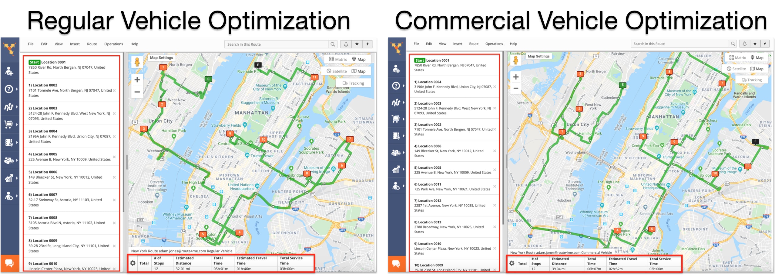Hơn nữa, giải pháp phần mềm định tuyến xe tải sẽ giúp bạn lập kế hoạch tuyến đường theo quy định giao thông dành cho xe tải. Ví dụ, xe tải không được phép lưu thông trên một số con đường và khu vực nhất định trong thành phố. Khi lập kế hoạch và tối ưu hóa tuyến đường cho xe thông thường, bỏ qua các giới hạn đường bộ dành cho CMV, bạn có thể chịu một khoản tiền phạt đắt đỏ. Bạn có thể thấy điểm khác biệt giữa kết quả của hai loại tối ưu hóa đã nêu bên dưới.
